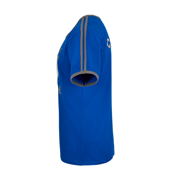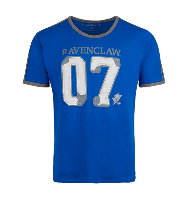 A comfy adult athletic T-shirt in striking Ravenclaw blue with white and grey applique of number 07 on the front and the name “Chang” on the back. Features “Ravenclaw” in grey screen print and grey embroidered house icon on front.