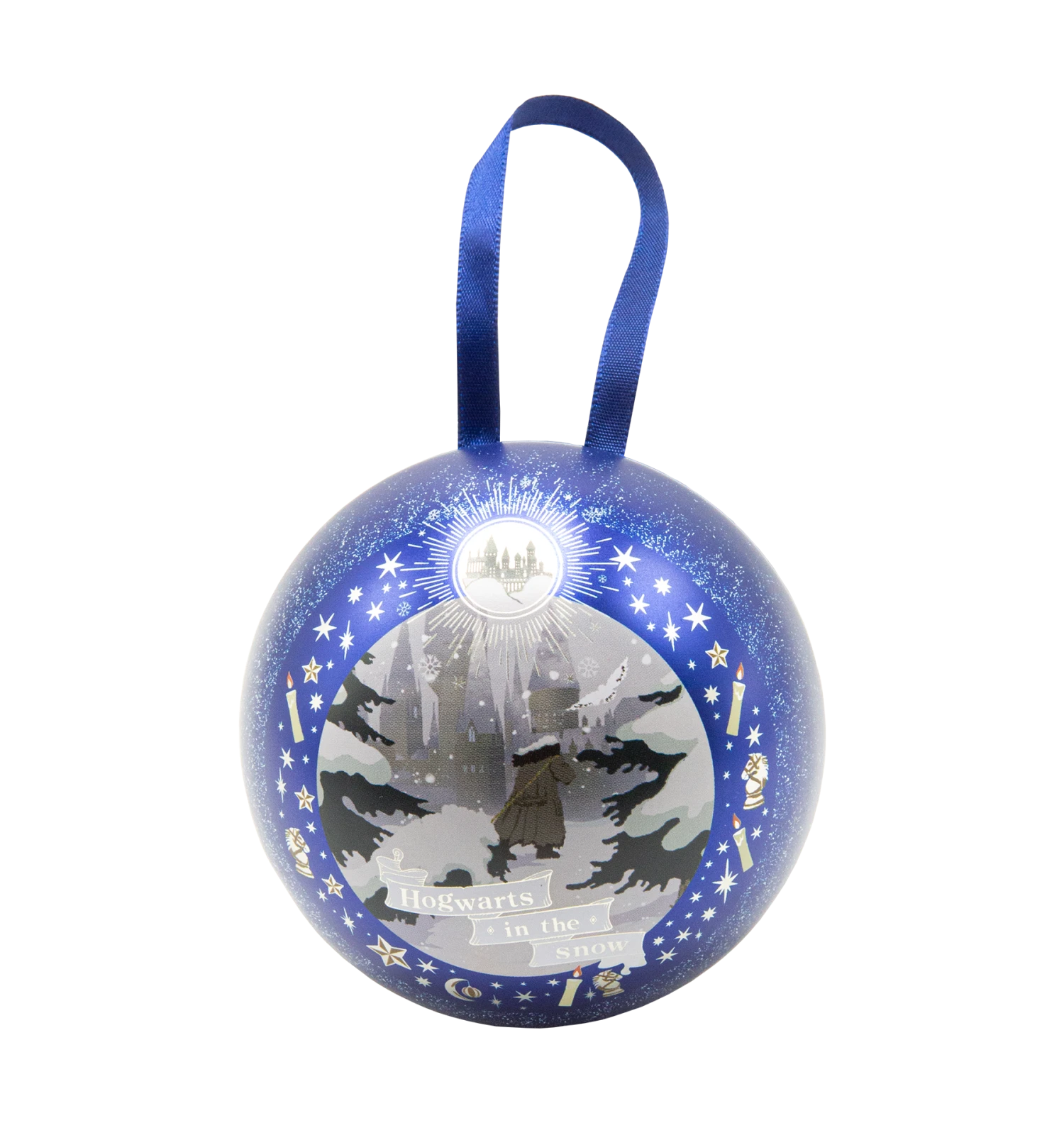 Crafted in a satin metallic navy tinplate, this decoration measures 8cm in diameterĀ and features an iconic Christmas scene from the Philosopher’s Stone. Hagrid pulls a freshly cut fir tree through the snow outside Hogwarts Castle. Stars, candles, and snowflakes surround the illustrative design while a scrolling white banner reads “Hogwarts in the Snow.” Silver accents and glitter dust the edges, with the reverse side showcasing the Wizarding World logo and classic Harry Potter font.